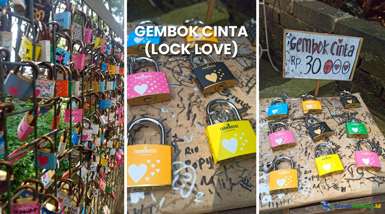Satu spot yang tidak kalah menarik adalah jembatan cinta untuk memasang gembok cinta. Kamu bisa membeli gembok cinta di tempat dengan harga Rp 30.000, lalu dituliskan nama kamu dan pasangan, dan dipasang di pagar atau jembatan cinta yang ada di sini. Katanya, gembok tersebut dianggap sebagai kekekalan cinta. Konsep ini mirip dengan yang ada di daerah Namsan Tower Korea atau Lock Love di Paris.