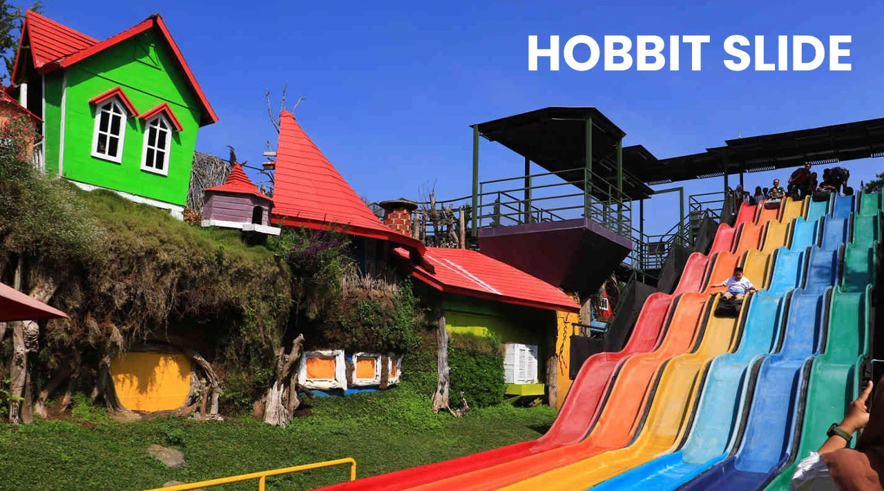 Sebelum bermain perosotan warna-warni di Hobbit Slide, kamu harus membayar tiket lagi sebesar Rp 25.000 untuk 2 (dua) kali meluncur dan ada paket Rp 45.000 untuk meluncur All Day sampe puas. Perosotan ini memiliki panjang 25-meter dengan ketinggian 7 meter. Wahana ini seperti miniatur dari Rainbow Slide di Floating Market yang panjangnya lebih dari 100 meter. Bedanya, di Hobbit Slide ini, kamu meluncur dengan menggunakan alas atau matras kecil, bukan ban. Anak-anak dengan tinggi di bawah 120cm wajib di dampingin sama orang dewasa, ya!
