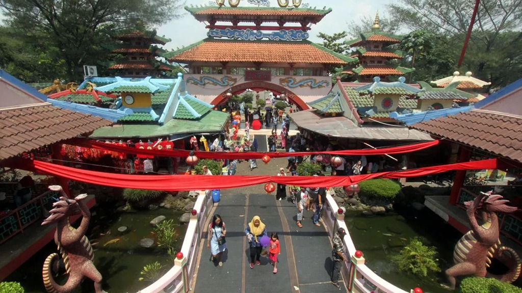 Sebenarnya objek wisata ini adalah sebuah kawasan perumahan yang di desain dengan gaya arsitektur Tionghoa. Mulai dari gerbang, pagoda, jembatan, patung, sampai replika bangunan-bangunan ala Tiongkok yang sangat kental sekali dengan nuansa merah yang cantik dan instagramable banget. Kamu juga bisa loh menikmati fasilitas di kota wisata ini seperti waterpark, golf, dan mall.