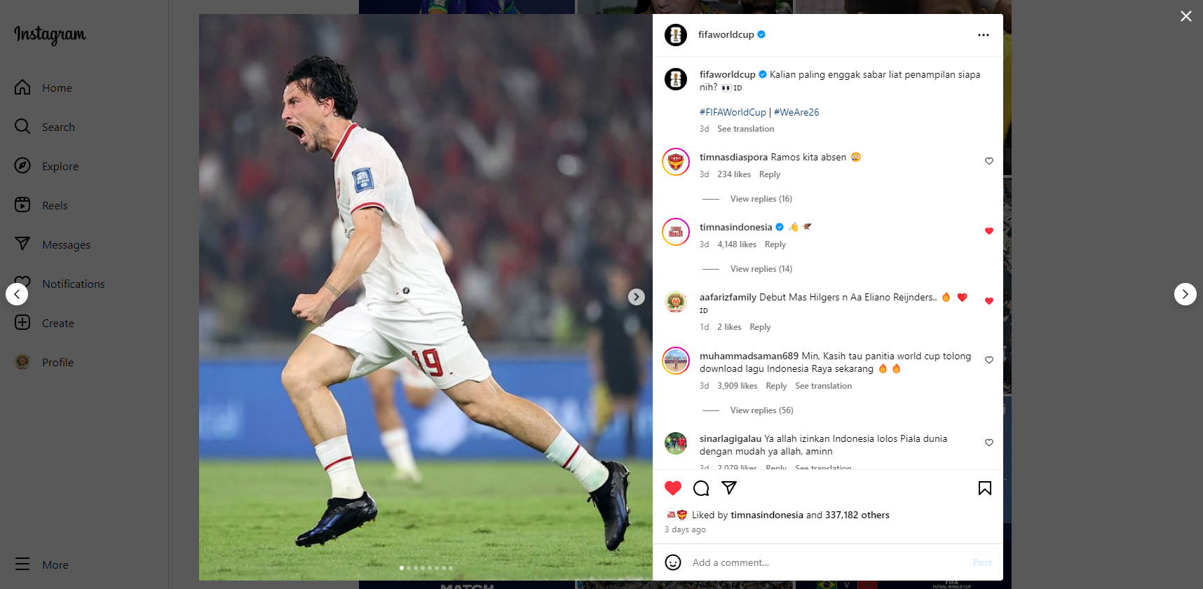 Akun Instagram FIFA World Cup terpantau jadi lebih sering ngepost seputar Timnas Indonesia. Netizen Indonesia: Adminnya pintar goreng terus fans Indonesia, Tau aja nih FiFA ngambil Hati Netizen Indonesia!