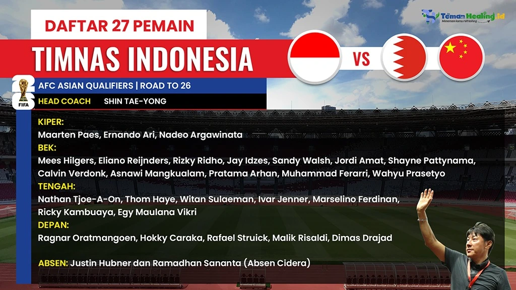 Halo, Bestie Healing! PSSI telah merilis daftar nama pemain Timnas Indonesia untuk Kualifikasi Piala Dunia 2026 Putaran Ketiga Zona Asia melawan Bahrain dan China.