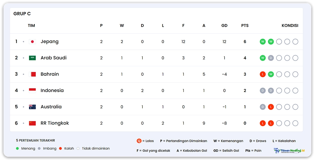 Saat ini Timnas Indonesia menduduki posisi keempat di klasemen sementara Grup C dengan 2 angka. Pasukan Shin Tae-yong hanya terpaut 1 angka dari Bahrain yang ada di posisi ketiga.