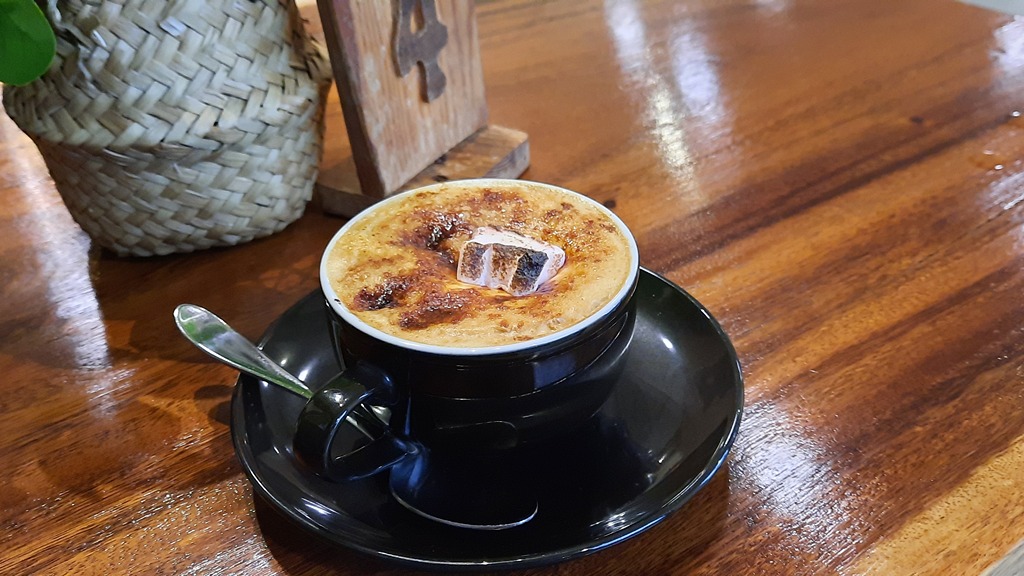 Minuman kopi ini diberi rasa karamel, vanila, atau krim brulee, dan disajikan dengan susu atau krim untuk memberikan rasa yang lembut dan kaya. Disajikan panas atau dingin, Creme Brulee Coffee di Kopi Magma ini dibuat dengan gula yang dibakar di atas permukaan minuman.