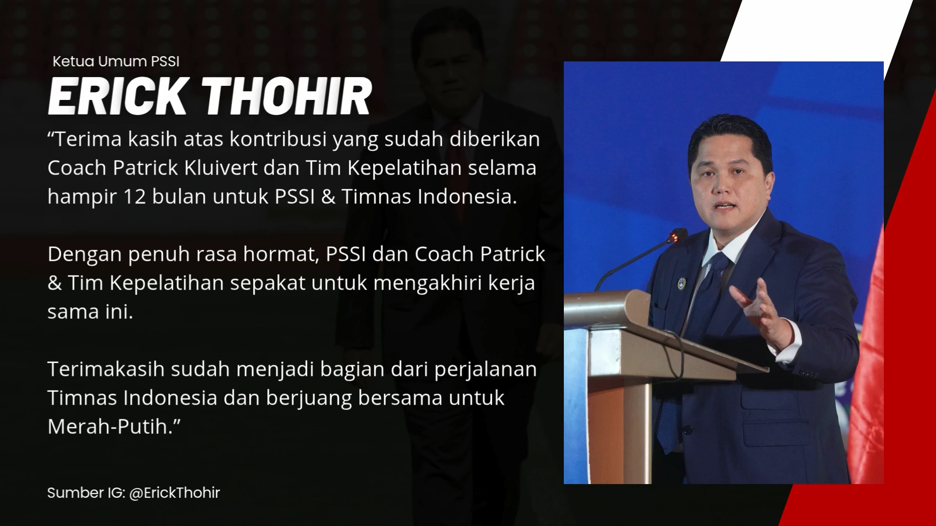 Bestie, akhirnya PSSI resmi mengakhiri kerja sama dengan Patrick Kluivert dan tim kepelatihan asal Belanda di semua level Timnas Indonesia. Keputusan ini katanya sih lewat mekanisme *mutual termination* alias sama-sama sepakat buat berpisah baik-baik.